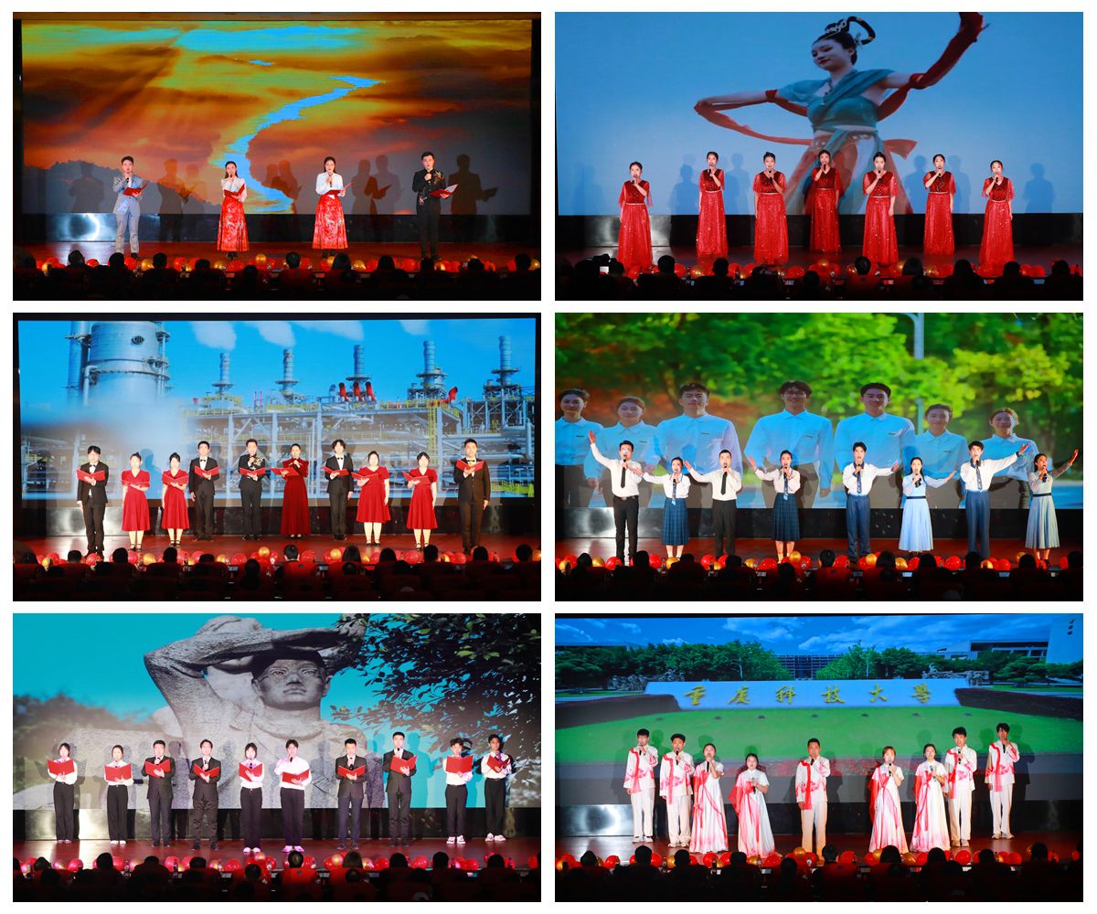 第一篇章《百年诗韵颂华章》《读辉煌中国担青年使命》《科技强国奋进重科》《化韵承章:“十四五”荣光映初心》深情回望新中国成立以来的峥嵘岁月,歌颂在中国共产党的领导下,国泰民安,人民安居乐业取得的辉煌成就,并生动展现了学校主动对接国家战略、勇担时代使命的责任担当。