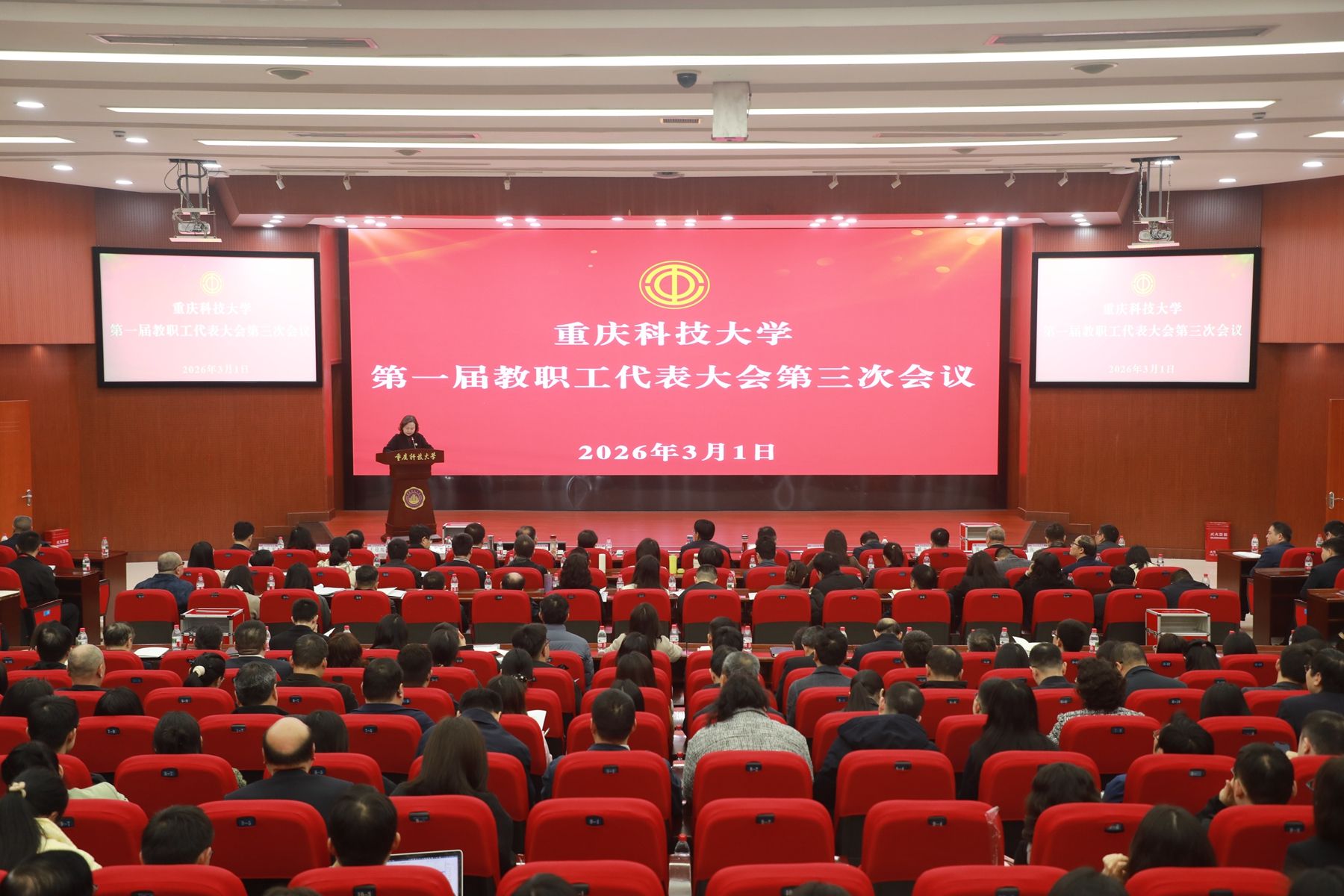 策马扬鞭奋蹄疾,乘势而上开新局。为总结学校发展成绩、部署2026年重点工作,凝聚全校上下奋进“十五五”的磅礴力量,3月1日,学校召开2026年春季学期开学教职工大会暨一届三次工代会、教代会。全体校领导、党委常委、科级以上干部、工代会、教代会代表等全体教职工参加会议。党委书记黎德龙主持教职工大会并讲话,校长赵明阶作学校工作报告。