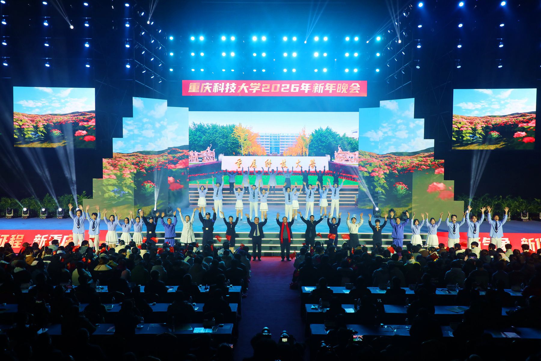 最后,全场3100余名师生共同唱响《歌唱祖国》,激昂的旋律回荡在体育馆上空,晚会在庄严而热烈的氛围中圆满落幕。 本次晚会延续“党政领导全员参与、师生校友同台献艺”的优良传统,通过多元艺术形式,既充分展现了重科校园文化建设的丰硕成果,彰显了学校文化育人的深厚底蕴,更有效凝聚起全校上下争创一流、共谋发展的强大合力,为学校“十五五”开局及申博攻坚、智创兴校的关键任务注入了强劲精神动力。